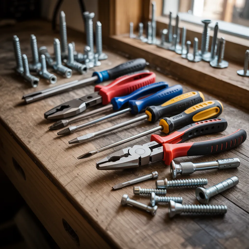 Various hand tools and construction hardware scattered on a rustic wooden surface, reflecting an industrial workbench aesthetic. Prominently featured are several screwdrivers with distinct colored rubber grips, pliers with wire cutter jaws, and metal anchors alongside matching screws – essential tools for any home repair or assembly project. The muted color palette of grays, blacks, and blues creates a understated, utilitarian vibe, allowing the textures of the weathered wood and metallic finishes to take center stage. This straightforward, no-frills arrangement exudes a sense of practical functionality, embodying the spirit of hands-on craftsmanship and meticulous workmanship.