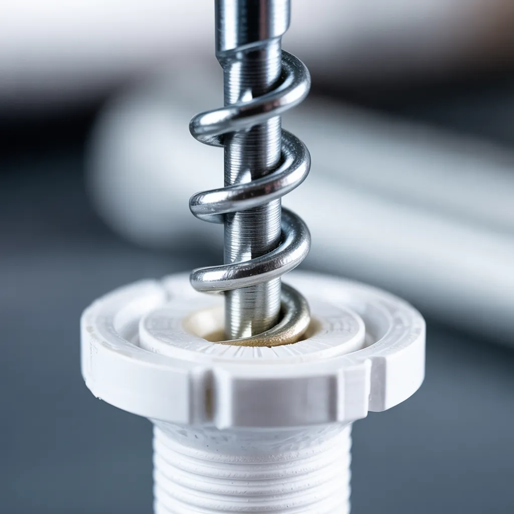 A tightly coiled metal corkscrew plunges into a ribbed plastic wall anchor, its spiraled tip gripping the interior firmly. The corkscrew’s industrial steel body contrasts starkly against the simple white anchor base. This utilitarian image showcases an ingenious household hack for removing stubborn wall anchors from drywall effortlessly. The sharpened corkscrew winds into the hollow anchor cavity, latching securely to extract it cleanly without damaging the surrounding surface. A practical, no-frills solution captured in monochrome tones of silver and white, simplicity embodied.