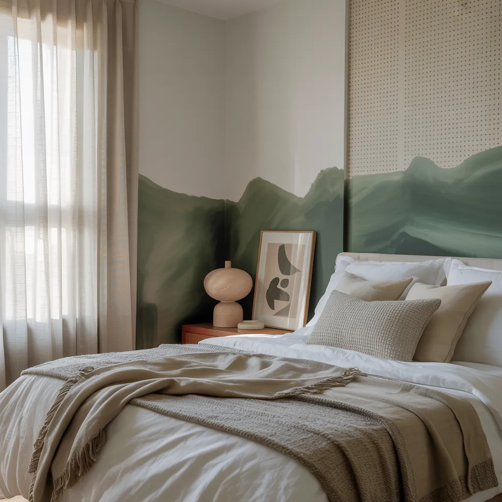 Airy and artful, this bedroom uses a hand-painted, mountain-like mural band to bring a soft landscape gesture into the space. Neutral bedding, tactile throws, and leaning artwork keep it relaxed and modern, with a playful, design-forward twist.