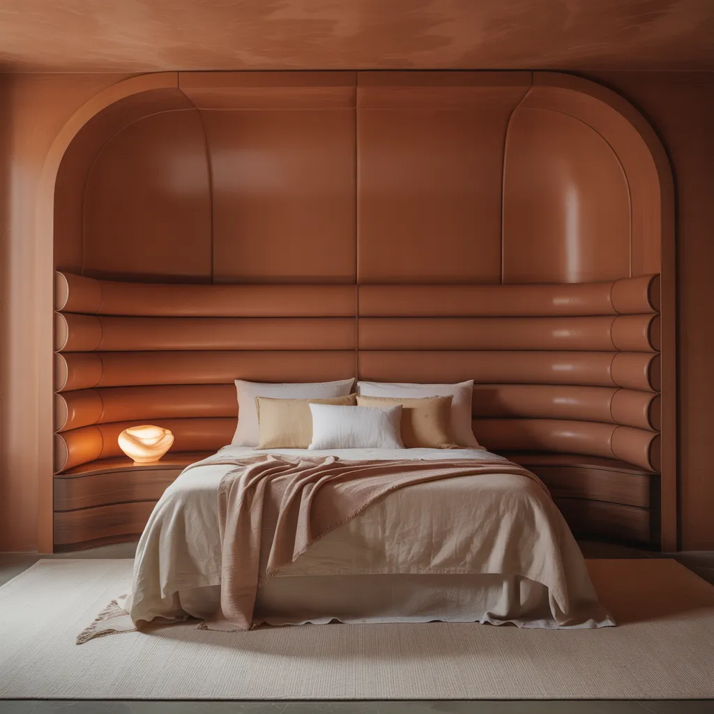 Retro-futuristic and cocooning, the arched, padded alcove wraps the bed in a terracotta-toned embrace that feels straight out of a ’70s design dream. Minimal linens and a single glowing lamp keep the drama focused on the sculptural architecture.