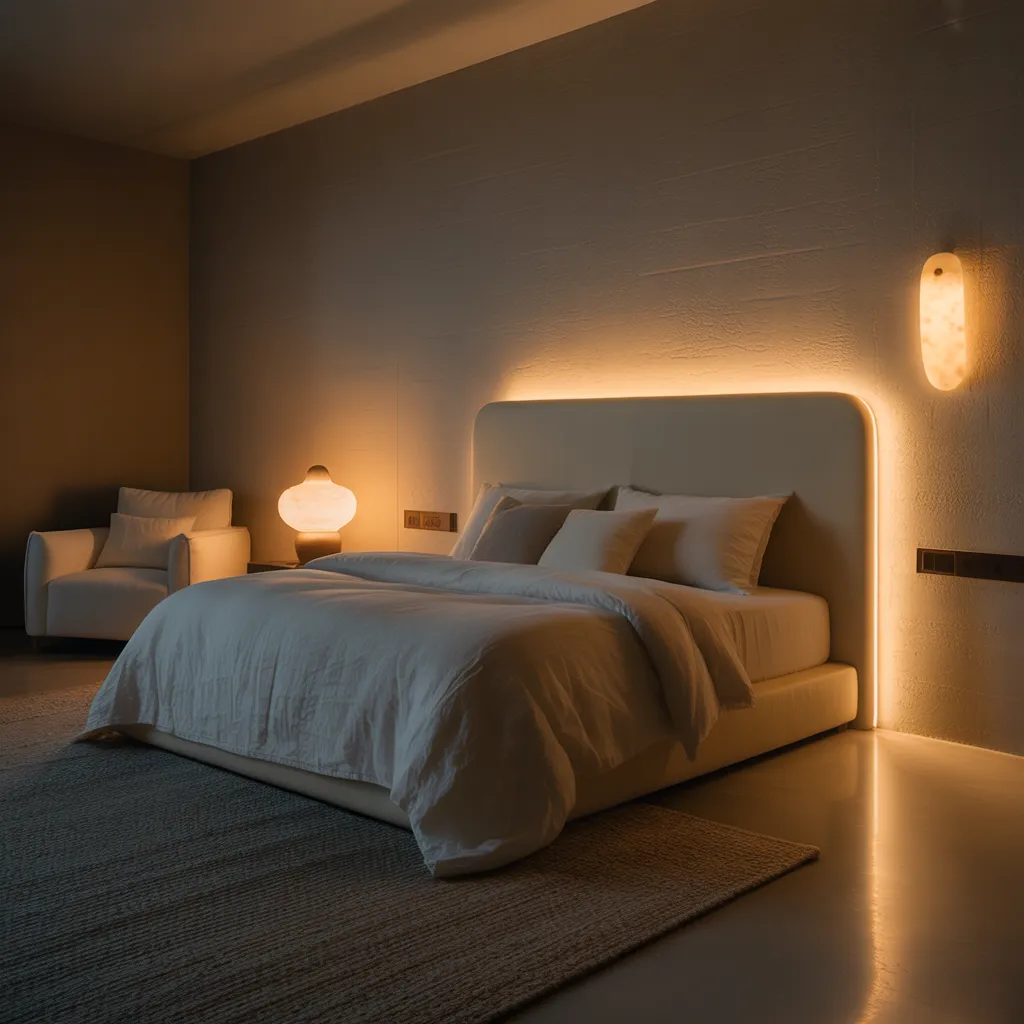 This room leans into low, amber lighting with a softly glowing headboard that outlines the bed like a halo. Sculptural lamps and pared-back furnishings give it a serene, gallery-like minimalism with a cozy nighttime hush.