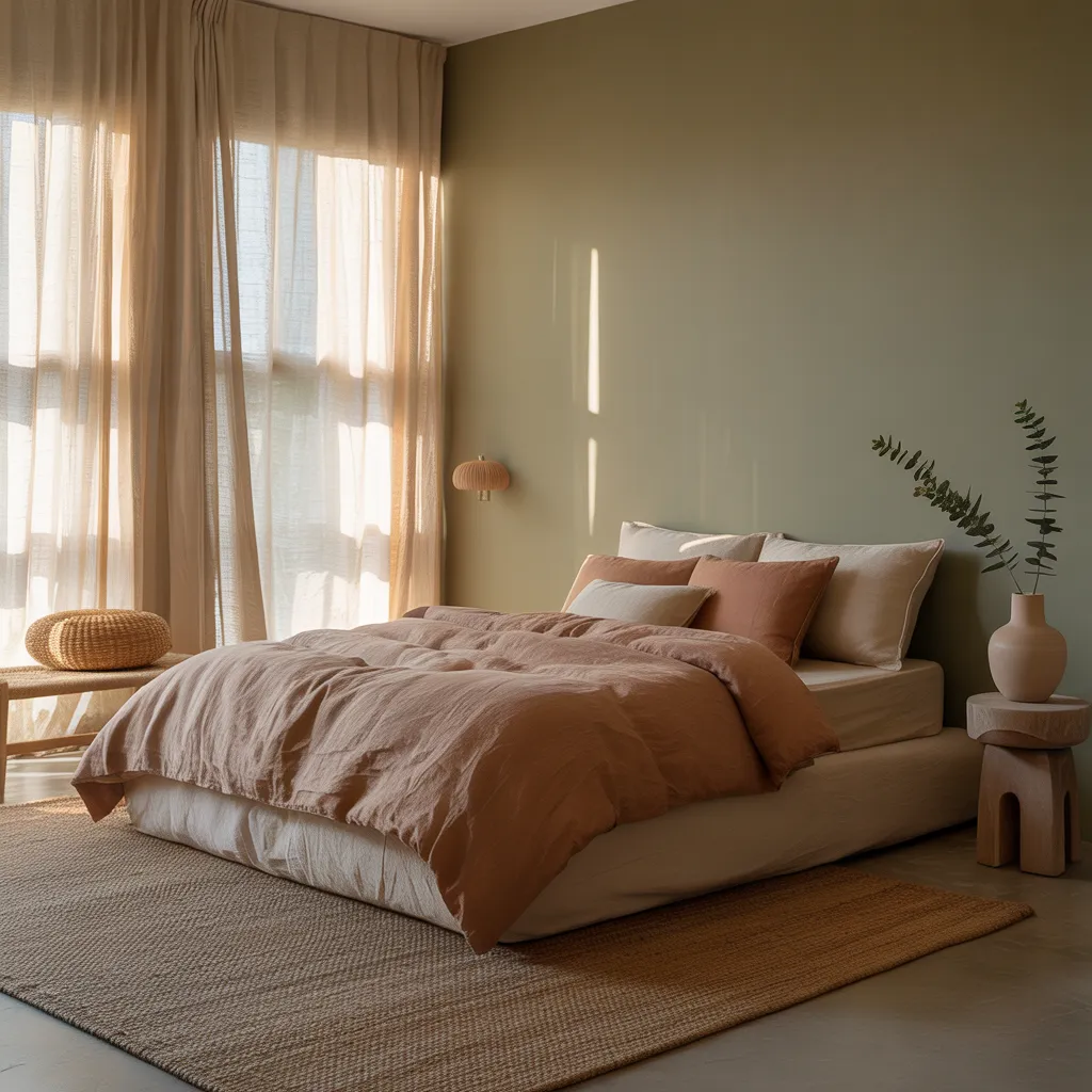 Sun-washed and quietly earthy, this bedroom pairs a sage-green wall with gauzy linen curtains and soft terracotta bedding for a calm, grounded feel. Natural textures—woven rug, rattan accents, and sculptural ceramics—keep the space warm, minimal, and effortlessly lived-in.