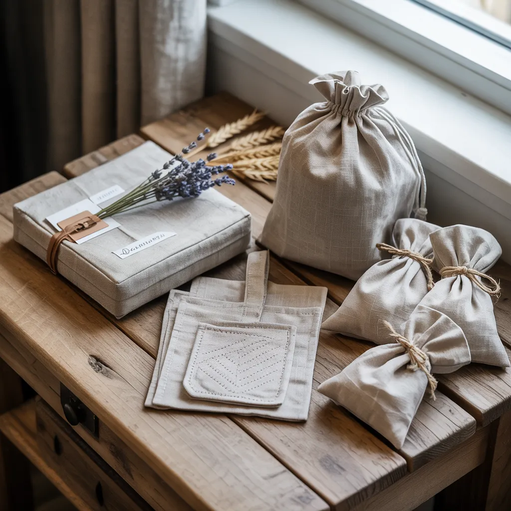 A collection of linen creations rests on a rustic wooden table near the window, exuding an earthy, minimalist aesthetic. Fabric pouches and bags in soft, natural hues are neatly arranged alongside a vintage-inspired book, lavender stems adding a delicate touch. The organic materials like linen, wood, and twine evoke a sense of sustainability and handcrafted warmth. Tones of oatmeal, ecru and faded olive create a gentle, harmonious palette, while the simple shapes and textures of the handmade items reflect a pared-back, contemporary rustic style with bohemian flair. The image invites one to embrace mindful living through thoughtfully curated, eco-conscious home decor elements.