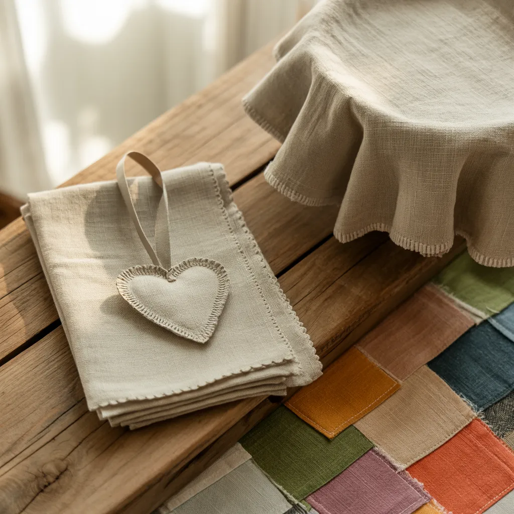 Linen napkins with a heart-shaped appliqué and frayed edges rest atop a wood surface alongside fabric swatches in muted earth tones. The understated rustic style incorporates natural textures like distressed wood and raw linen, creating a warm, inviting ambiance. The color palette features soft neutrals – creams, tans, olive greens, and terracotta accents that lend an organic, earthy feel. This artisanal vignette celebrates the imperfect beauty of handcrafted textiles, embracing the timeless allure of simple, sustainable design with a hint of nostalgic charm.