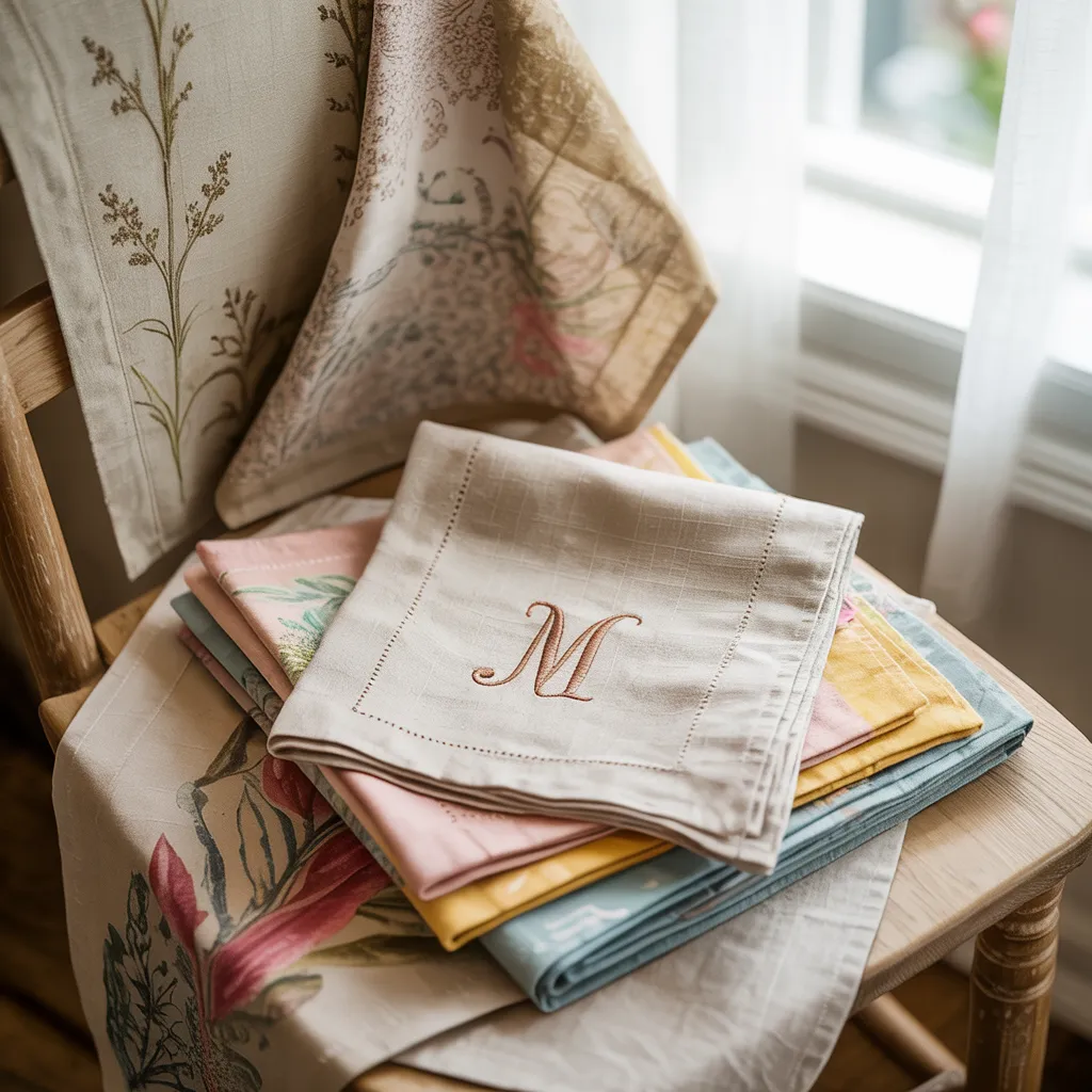 A stylishly decorated sitting nook showcases a stack of monogrammed linen napkins in pastel hues alongside a floral patterned throw pillow. The muted color palette combines natural beiges, soft blues, yellows, and pinks, creating a serene, romantic ambiance. The linen textiles, adorned with delicate embroidery, exude a timeless yet fresh bohemian aesthetic. Complementing the cozy scene is an ornately carved wooden side table that lends a touch of rustic charm to this inviting, sunlit corner, beckoning one to savor a tranquil moment of repose amidst the tastefully curated decor elements.