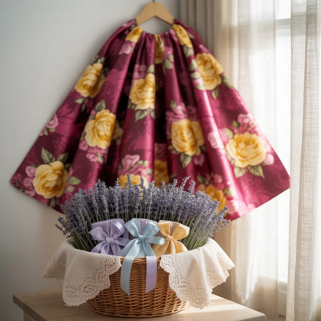 A sumptuous floral skirt hangs languidly from a wooden hanger, boasting an exquisite pattern of golden roses adorning a deep maroon backdrop. A rustic woven basket overflows with fragrant lavender stems, their silvery hues delicately enhanced by pastel ribbons. This charmingly rustic vignette exudes a romantic, cottage-inspired ambiance with its harmonious blend of rich colors and natural textures. The delicate lace trim on the basket and the vibrant floral motif evoke a delightful bohemian flair, perfectly encapsulating the essence of artisanal craftsmanship and homespun warmth.
