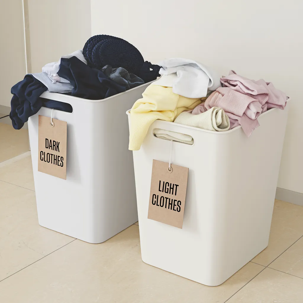 Two classic laundry baskets stand side by side, one labeled “DARK CLOTHES” and the other “LIGHT CLOTHES,” neatly separating garments by their color. The dark basket overflows with navy and black items, while the light one contains pale yellows, whites, and soft pinks. The minimalist design features clean white plastic baskets with simple wooden accent tags. The practical yet stylish organization system exudes a crisp, contemporary aesthetic through its monochrome palette and sleek lines. The durable plastic and natural wood materials lend a touch of warmth while prioritizing functionality. This visual representation effectively illustrates the straightforward process of sorting laundry by shade for optimal cleaning results.