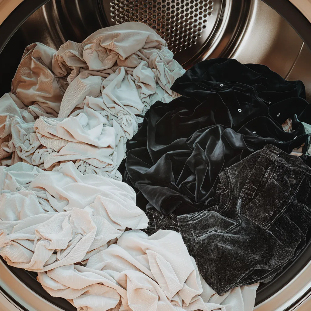 A chaotic jumble of light and dark fabrics spills out of a dryer’s drum, illustrating the lint-attracting perils of mixing laundry loads. Delicate nude and sky blue tones mingle with inky blacks and grays, showcasing how lint can spread indiscriminately between garments. Crumpled textures range from silky satin to rugged denim, exemplifying how different weaves are susceptible to lint cling. The cool stainless steel interior provides an industrial backdrop for the soft fabric piles, highlighting the necessity of separating delicates from rougher pieces to prevent unsightly fuzz transfer and maintain a fresh, crisp wardrobe.
