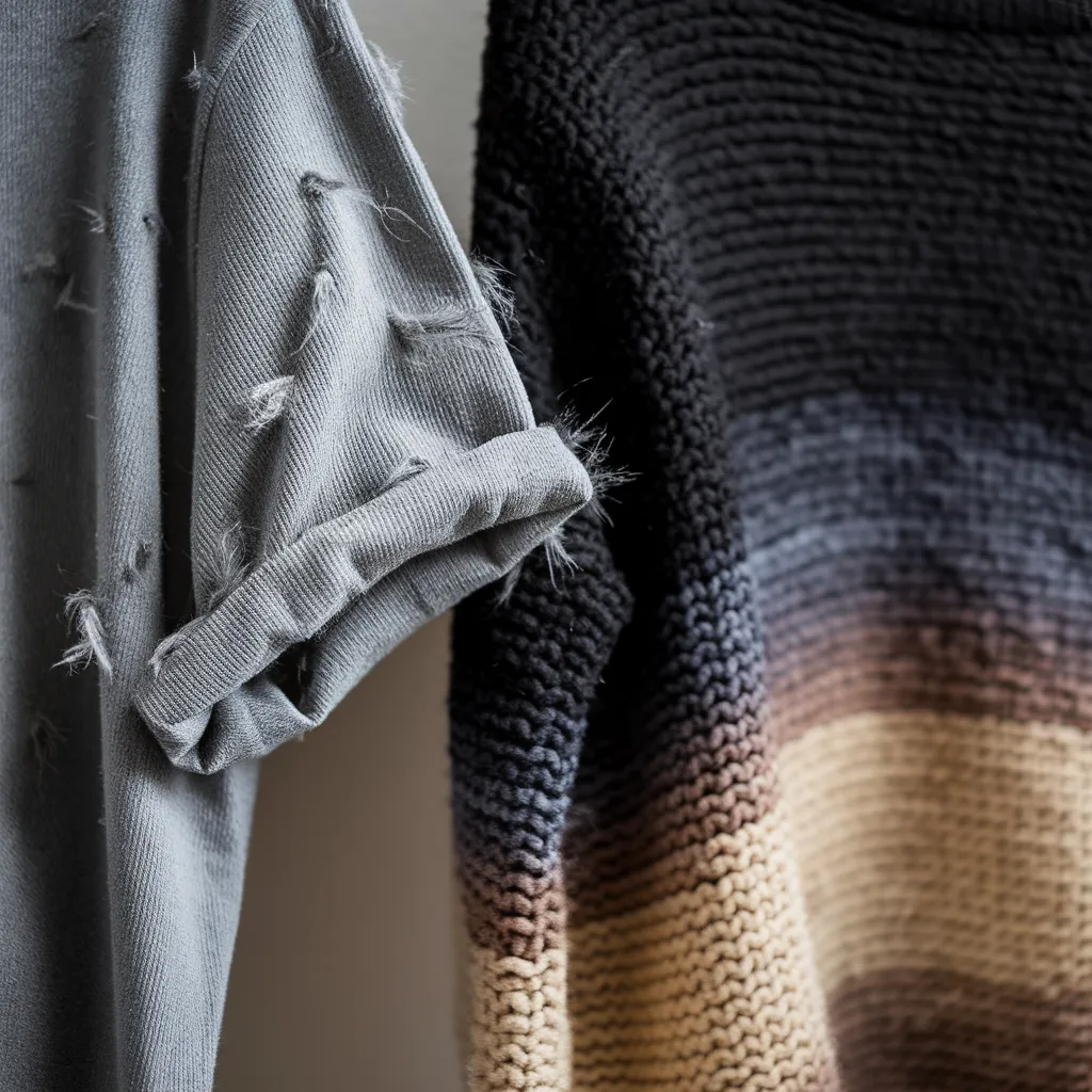 Two clothing items hang side by side, contrasting starkly in both color and texture. A gray t-shirt displays scattered tufts of fuzz clinging to its surface, an unintended rustic embellishment. Beside it hangs a chunky black knit sweater with ombré shading, gradually fading from deep charcoal to soft oatmeal hues. The juxtaposition highlights the consequences of improper laundry sorting – the fuzzy shirt likely shedding onto darker items, while richly dyed fabrics can bleed pigment onto lighter garments. The neutral palette, dominated by urbane grays and blacks, aligns with a modern, minimalist style. The varied textures, from the napped knit to the smooth cotton, showcase the diverse material mix found in contemporary wardrobes. This visual encapsulates the importance of separating lights and darks to preserve clothing’s pristine quality.