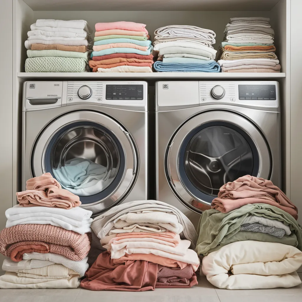 Two front-loading washing machines hold loads of neatly folded clothes in various shades – from bright whites and soft pastels to rich blues and earthy tones. The simple yet functional laundry room showcases a minimalist, contemporary style with sleek metallic appliances and clean lines. The piles of clothing textures highlight materials like cozy knits, crisp cottons, and airy linens in the neutral color palette spanning creams, grays, and muted mossy greens. Thoughtful wardrobe care ensures maximum longevity through considerate sorting, gentle cycles, and preventing excessive wear from friction or heat exposure.