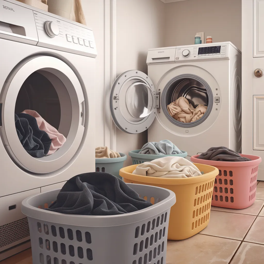 An orderly laundry room with two front-loading washing machines and baskets overflowing with neatly sorted lights and darks. The sleek, contemporary appliances in crisp white blend seamlessly with the surrounding neutral tones of beige tile floors and pale mint green walls. Practical plastic laundry baskets in pastel shades of yellow, pink, and blue house piles of clothing waiting to be washed or dried, highlighting efficient organization. The scene exudes a minimalist aesthetic with its clean lines, muted color palette, and uncluttered space – the very essence of functional simplicity for this utilitarian area.