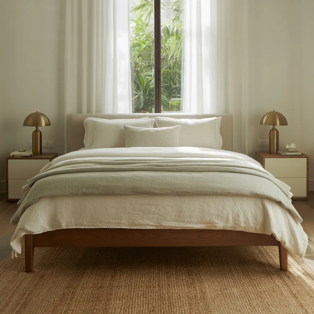 A serene, minimalist bedroom with crisp linen bedding in soft neutral tones welcomes natural light from the window overlooking lush greenery. The sleek wood bed frame and matching nightstands with golden metal lamps create a warm, grounded aesthetic. Smooth lines and muted earth tones of the furniture blend harmoniously with the understated beige color palette. Textures like the nubby area rug add subtle depth while maintaining a pared-back, tranquil ambiance ideal for rest and relaxation.
