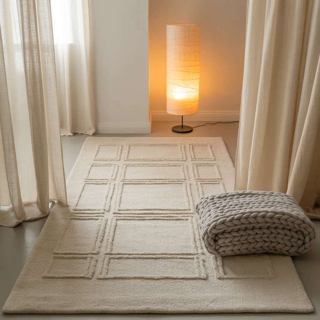 A cozy nook bathed in warm, ambient light from a woven cylinder lamp emanates a sense of tranquility. A plush, chunky knit footstool in a gentle greige tone lends inviting texture beside a geometric patterned area rug in neutral hues that anchors the space. Sheer, gossamer curtains frame the soothing vignette, epitomizing modern minimalist style through an edited mix of natural materials like wool and cotton textiles accented by sleek black metal. The soft, earthy color palette cultivates an aura of understated elegance and calm ideally suited for rest and rejuvenation.