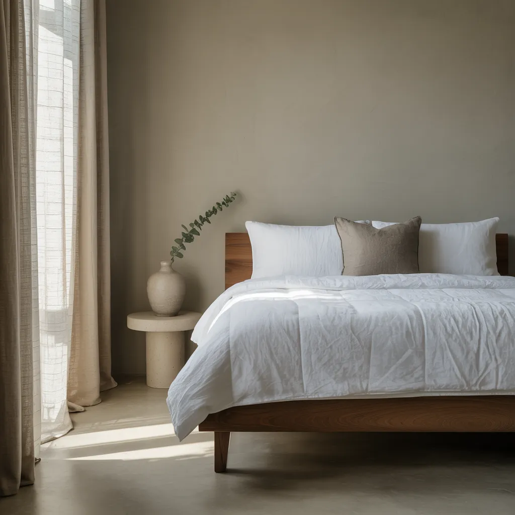 A serene, minimalist bedroom with clean lines and a calming neutral color palette. The taupe-hued linen bedding and warm wood platform bed exude understated elegance, while a simple ceramic vase displays a graceful eucalyptus stem. Sheer curtains filter in soft natural light, casting gentle shadows across the room. The muted tones of tan, cream, and greige create a soothing, pared-back ambiance that invites relaxation and respite from sensory overload. With its harmonious blend of natural textures and soft, organic accents, this tranquil space epitomizes the rejuvenating essence of minimalist design.