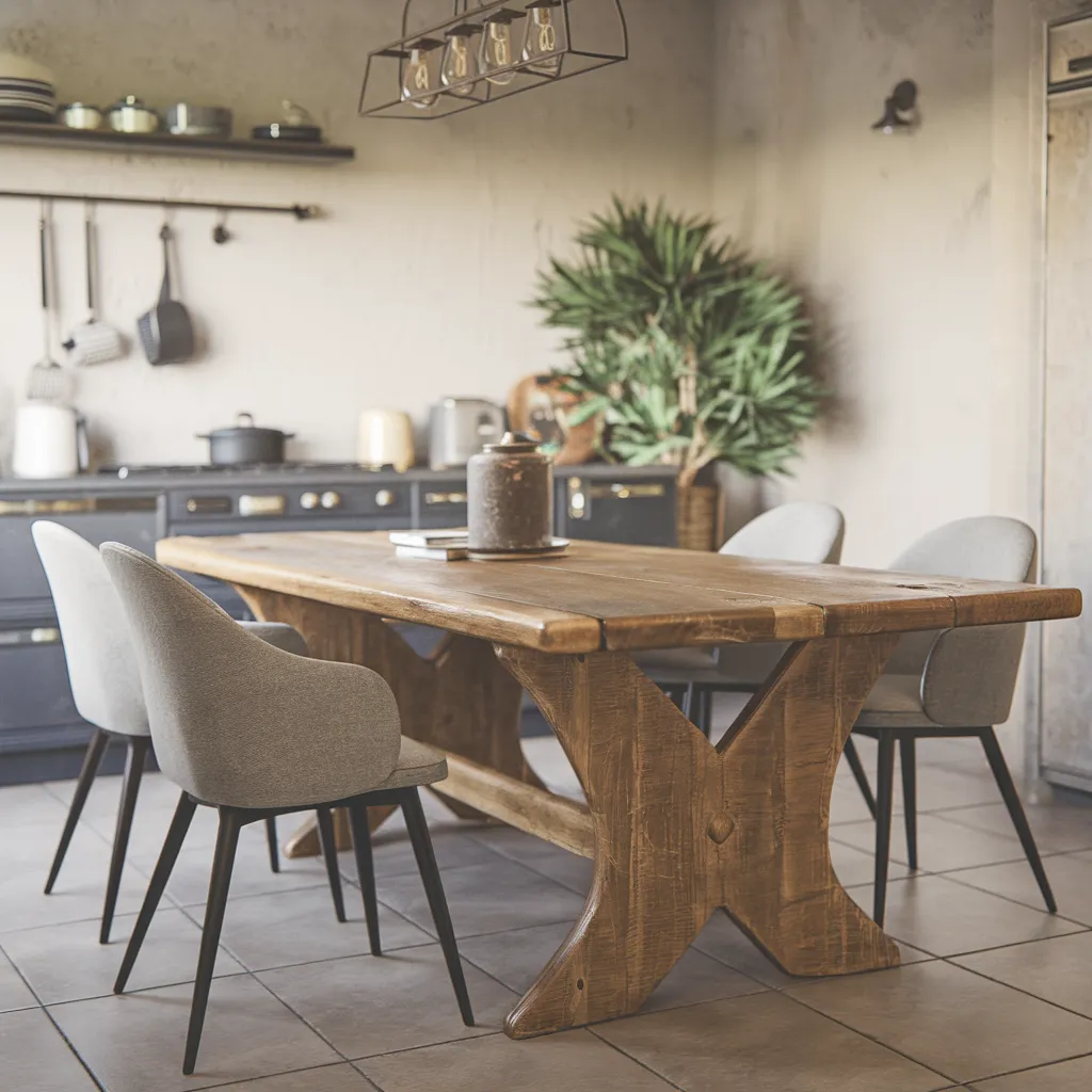 A warm, rustic wooden dining table commands attention, its distressed surface exuding rustic charm. Surrounded by plush upholstered chairs with sleek metal legs, it blends modern and vintage elements seamlessly. Overhead, an industrial-chic hanging lamp casts a cozy glow. Oak wood tones, creamy whites, and soft grays create an inviting, neutral palette punctuated by the vibrant greenery of a potted palm. The open kitchen boasts classic subway tiles and dark cabinetry, merging seamlessly into this organic, lived-in space brimming with character – the quintessential soft kitchen aesthetic where timeless style meets modern comfort.