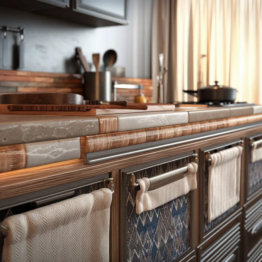 An inviting culinary space showcasing a thoughtful mix of textures and natural materials. A rustic wooden cabinet base features woven baskets for storage, with a sleek marble countertop providing contrast. Shades of warm brown, gray, and cream dominate the calming color palette. The smooth, polished wood and iron bars used for the cabinet pulls and shelving introduce subtle metallic accents. Linen tea towels draped over the cabinet drawers add a cozy, homespun touch to this rustic-meets-contemporary kitchen styling.