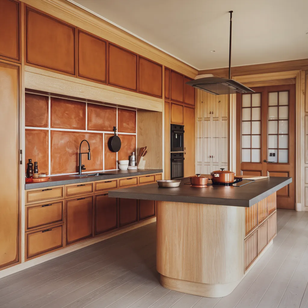 A serene, inviting kitchen with warm, earthy tones and natural textures invites relaxation. Light wood cabinets with antique brass hardware lend a homey yet refined aesthetic. An array of wooden cooking utensils, ceramic crocks, and potted greenery introduce rustic, organic accents. Creamy off-white walls and neutral tan shades create a calming backdrop. Matte terracotta tiles and butcher block countertops add subtle earthy contrast and visual interest, capturing the essence of soulful, nurturing design inspired by nature’s muted palette. The overall soft contemporary style exudes a sense of understated elegance and tranquility.