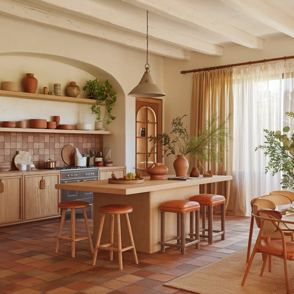 The space exudes a cozy, eclectic style with its blend of natural materials and earthy tones. Light wood cabinetry, exposed shelving with earthy ceramic accents, and abundant potted greenery create an organic, inviting atmosphere. The terracotta-tiled floor grounds the space with rich warmth, while the creamy wall color and sheer curtains lend an airy feel. Leather-seated stools and a plush upholstered bench offer comfortable seating around the substantial island. This tranquil, lived-in scene encapsulates the soft kitchen trend, where the kitchen transcends utility to become a nurturing gathering space for communion and contentment.