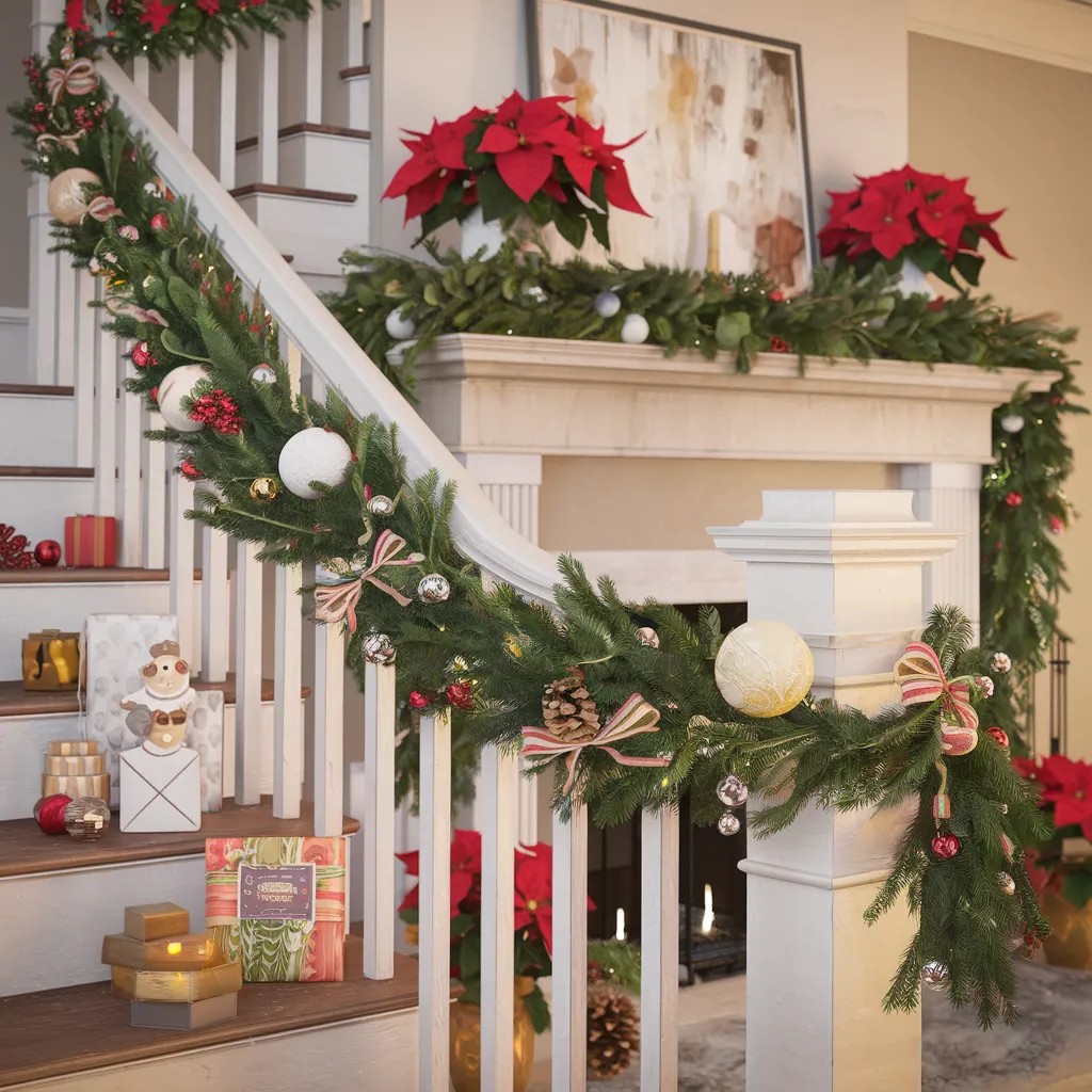 A festive Christmas display featuring evergreen garlands adorned with red poinsettias, ornaments, pinecones, and ribbons. The staircase railing is draped with lush greenery punctuated by sparkling baubles and pops of red, white, and metallic accents. Below, a fireplace mantel showcases poinsettia plants and a garland swag, complemented by candles and holiday decor in shades of red, white, and natural wood tones. Overall, the scene exudes a warm, traditional Christmas aesthetic with rustic and contemporary elements. Natural materials like evergreen boughs, pinecones, and ribbons lend a cozy, rustic touch, while metallic accents and crisp white surfaces provide a fresh, modern contrast. The vibrant red poinsettias act as striking focal points against the neutral background, creating a festive and inviting holiday ambiance.