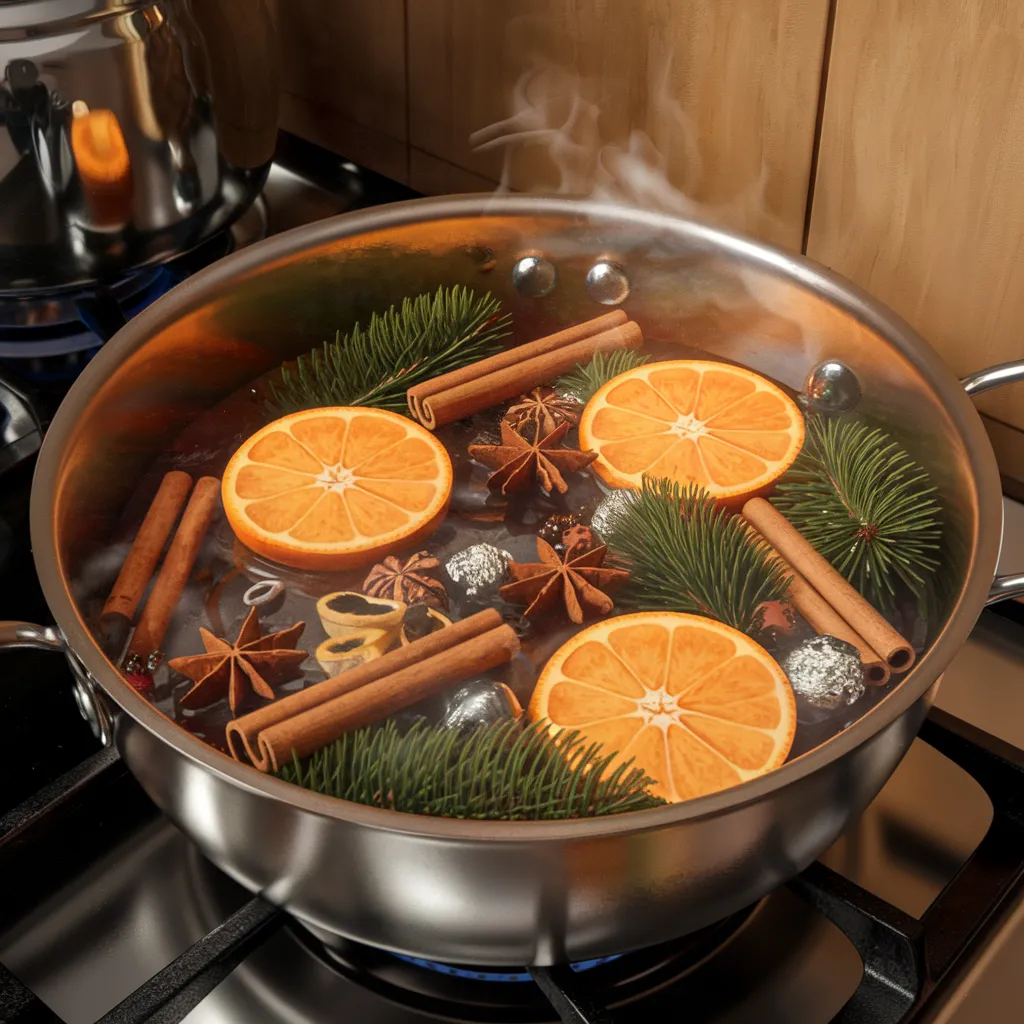 A rustic pot filled with oranges, pine branches, cinnamon sticks, and other festive elements sits atop a gas stove, its blue flames flickering beneath. The scene evokes the warm, homely atmosphere of the holidays. The dominant materials are natural – wood, citrus, and evergreens, with touches of stainless steel. The color palette features deep, rich oranges contrasted against lush greens and the muted grays and browns of the stove and wooden cabinets, creating an inviting, down-to-earth vibe with subtle holiday accents. The overall aesthetic leans towards a cozy, rustic interpretation of seasonal decor.