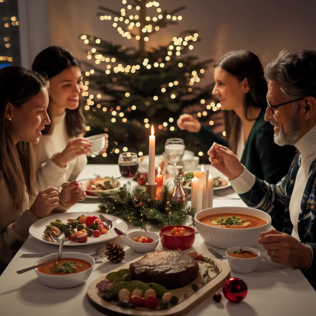 A cozy family scene unfolds around a rustic wooden table, set with a beautifully roasted turkey as the centerpiece. Amidst the warm glow of candles and twinkling lights from the Christmas tree, parents and children gather, smiling as they enjoy this special moment together. The interior design exudes a homely, traditional style with plush fabrics in muted tones like creams, greens, and grays. Natural materials like wood and ceramic lend an earthy, inviting ambiance, perfectly capturing the coziness of a family Christmas celebration filled with cherished memories in the making.