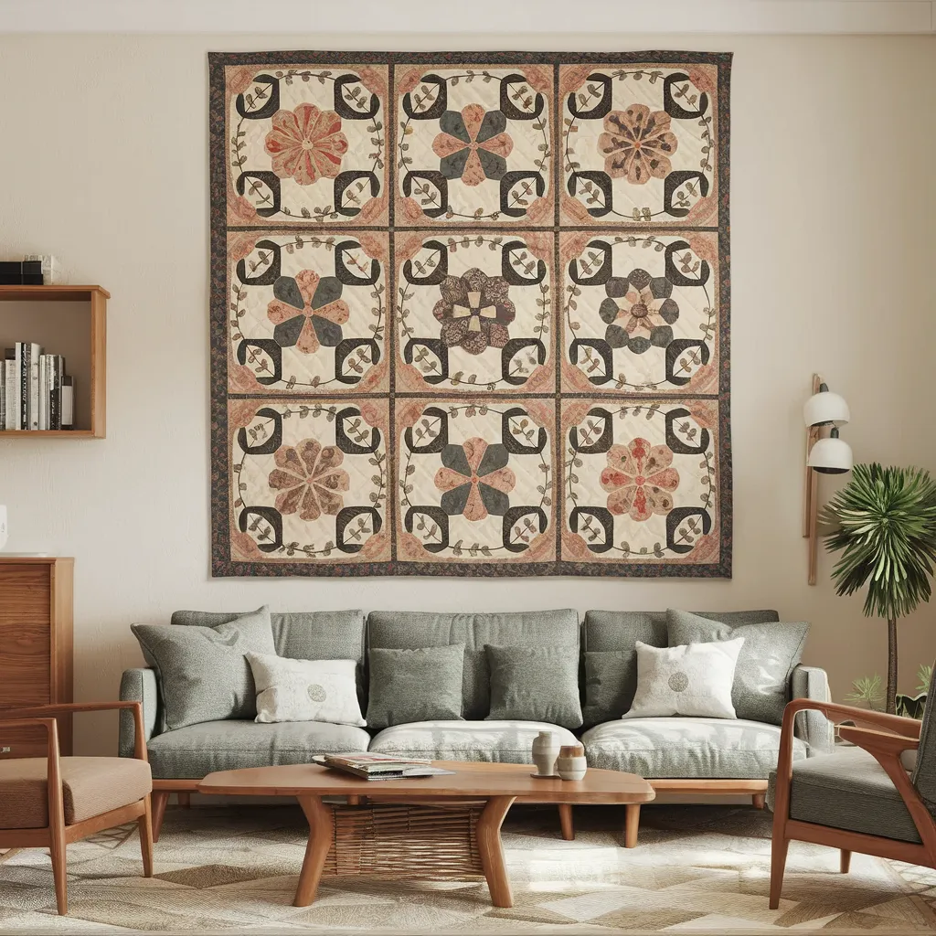 An oversized wall hanging featuring nine quilted squares dominates this cozy living room. The patchwork design showcases intricate stitching in a palette of muted terracotta, charcoal, and ivory hues arranged in stylized floral motifs. This textile wall art exemplifies a rustic, homespun aesthetic with natural materiality. Soft gray upholstery in linen and cozy woven throws echo the warm neutrals, complemented by richly stained oak wood furnishings. Eclectic decorative accents like potted greenery and ceramic lamps add organic texture. The artful repurposing of vintage quilts into oversized wall hangings lends a nostalgic, storied ambiance to this inviting rustic-modern living space.