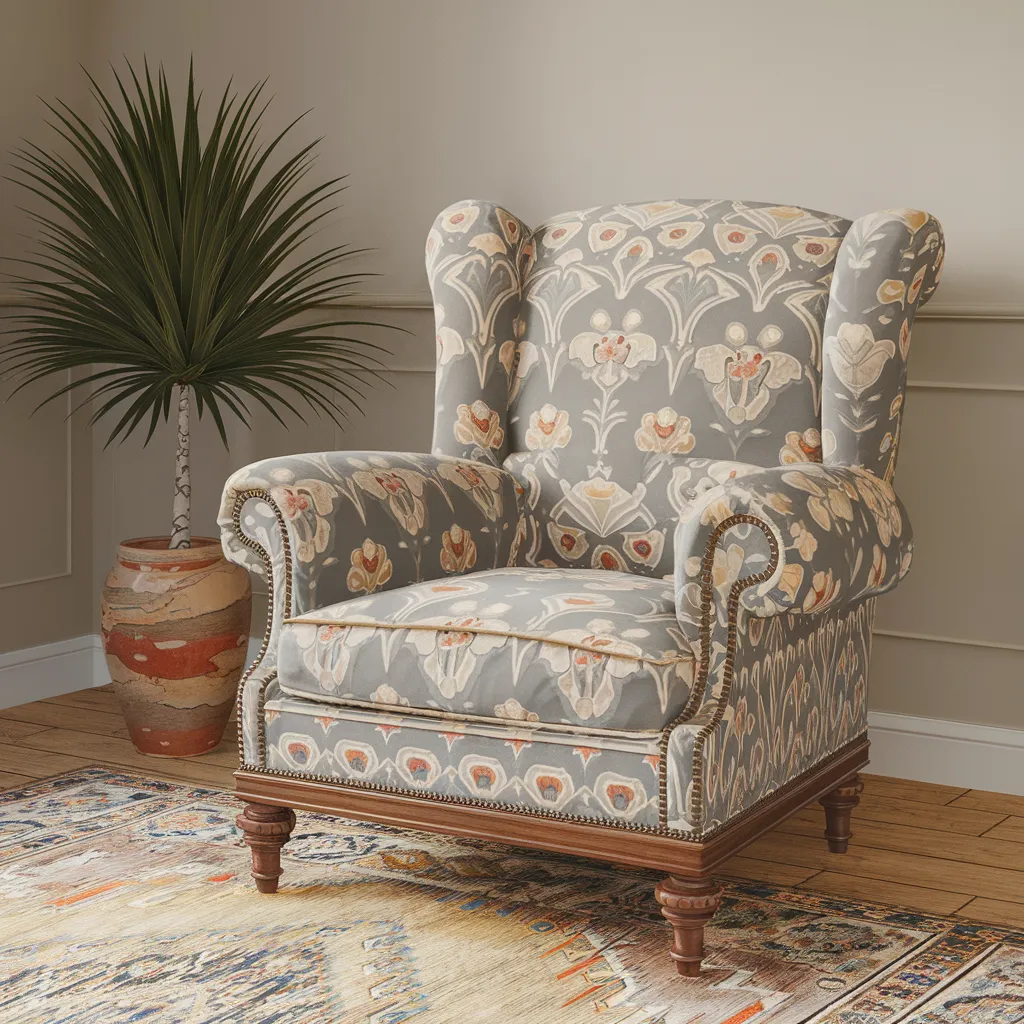 An ornate upholstered armchair takes center stage, upholstered in a floral ikat pattern featuring shades of peach, gray, and white against a charcoal background. The traditional style armchair features intricately carved wooden legs and nailhead trim, hinting at a transitional or eclectic interior style. The dominant materials are upholstery fabric, likely a blend like cotton or linen, offset by distressed terracotta ceramic planters. The warm, earthy color palette combines muted grays, tans, and rust tones, complemented by green accents from the large potted plant. The richly patterned area rug adds depth with its faded blue, red, and orange hues against a cream backdrop, tying the cozy and inviting living space together.