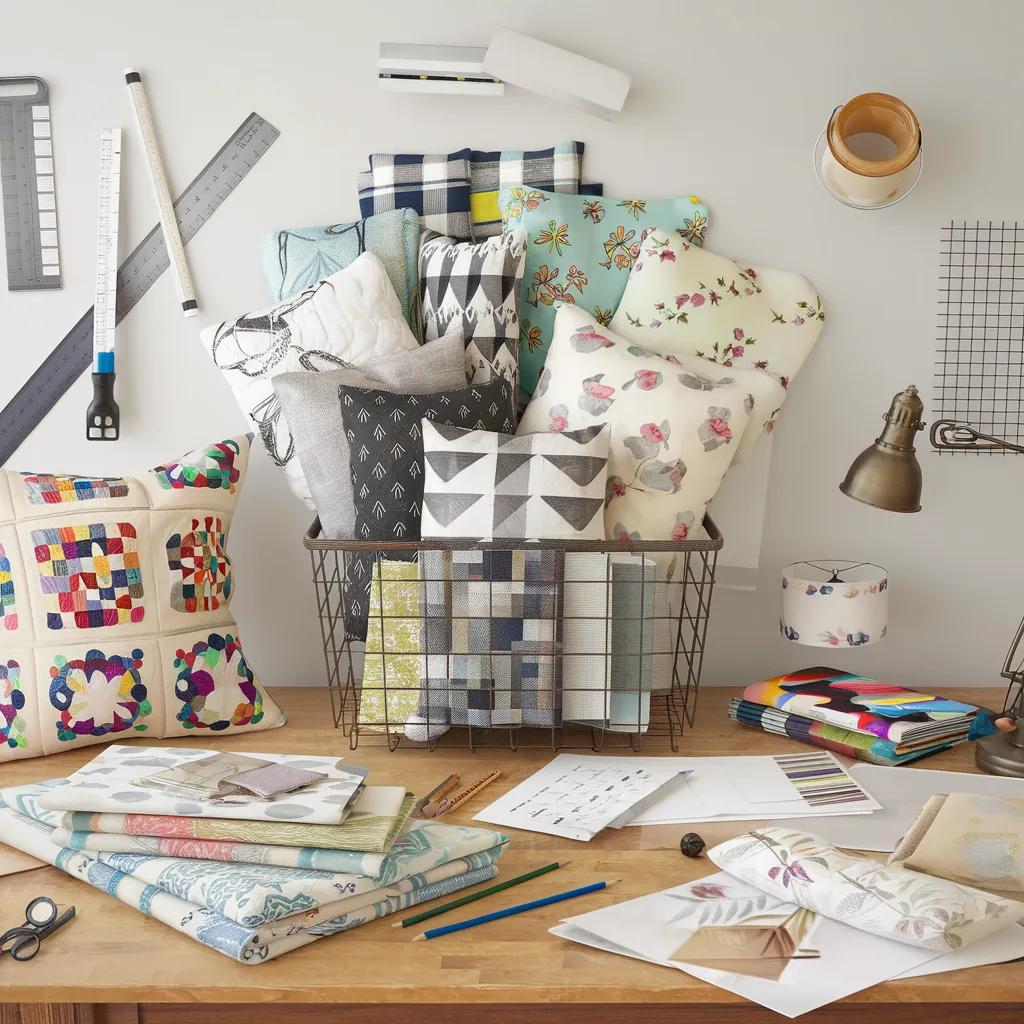 A clutter of textile swatches, sketches, and design tools occupy a rustic wooden desk – a colorful bohemian workspace. Intricately patterned fabrics in earthy shades of sage, terracotta, and dusty pink mingle with striped and checkered linens. Woven baskets brimming with vibrant color samples and ceramic objets d’art create an eclectic, artisanal vignette. The dominant neutral palette anchored in natural wood and creams allows the jewel-toned textiles and metallic accents to pop. This organized chaos speaks to a creative process grounded in sustainable repurposing of quality materials into unique textile designs.