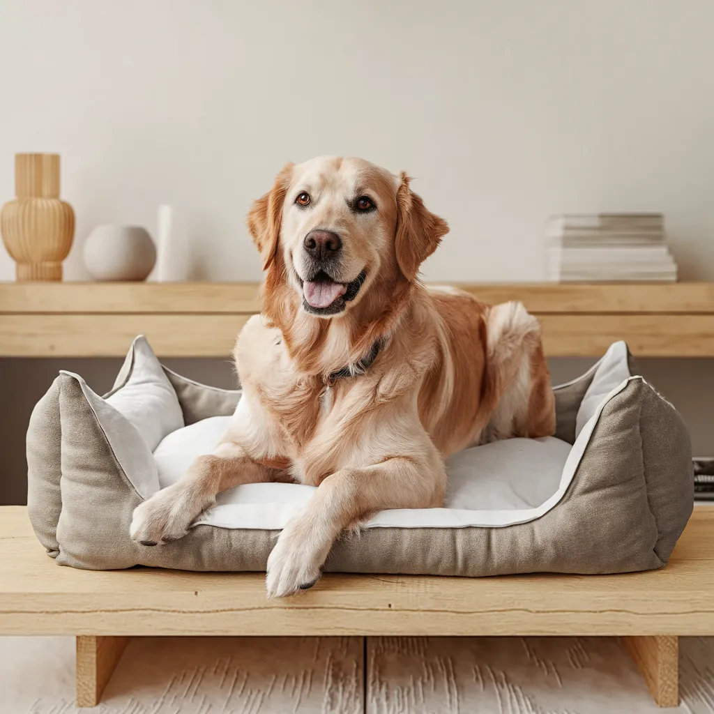 A large golden retriever lounges contentedly on a plush gray dog bed, mouth open in a cheerful grin. The bed features raised bolster edges, creating a cozy nest. Its minimalist, clean design with neutral tones beautifully complements the contemporary setting – a light wood shelf topped with simple decor pieces like ceramic vases. The warm yet muted color palette of grays, tans, and creams evokes a sense of tranquility suited to this pet-friendly living space. The materials used, such as plush upholstery fabric for the bed and solid oak for the furniture, exude quality while maintaining an understated elegance.