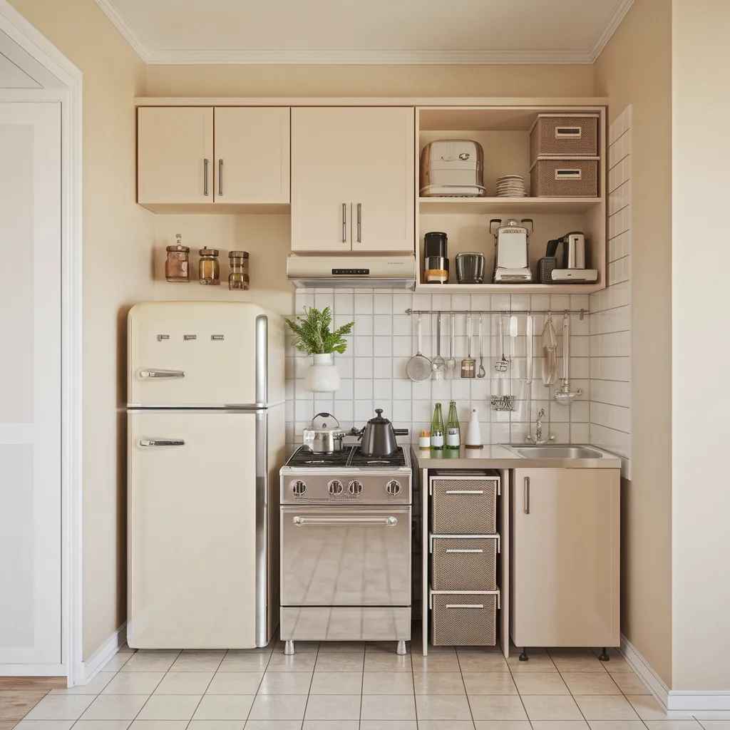 This tiny city apartment kitchen features minimal cabinet space and a very compact layout, with each area carefully organized to maximize storage. The beige cabinets, cream retro fridge, and stainless steel stove are all closely arranged, making the most of every available inch. Open shelves, wall hooks, and woven baskets add clever storage solutions for the limited space. Despite its small size, the light colors and smart design create a functional and inviting atmosphere.