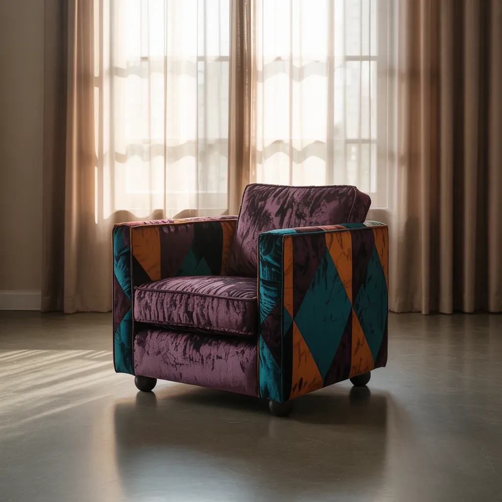 A plush armchair draped in rich purple velvet stands out against large windows with sheer curtains, providing a glimpse of the outside world. The armchair’s striking appearance features bold geometric patterns in shades of teal, orange, and brown against the deep purple upholstery, creating a modern bohemian vibe. The luxurious crushed velvet textures play with light and shadows, adding depth and visual interest. This daring fusion of vibrant colors, dynamic patterns, and luxurious materials challenges traditional design norms, showcasing velvet’s versatility to adapt to contemporary, avant-garde styles while retaining a sense of opulence.