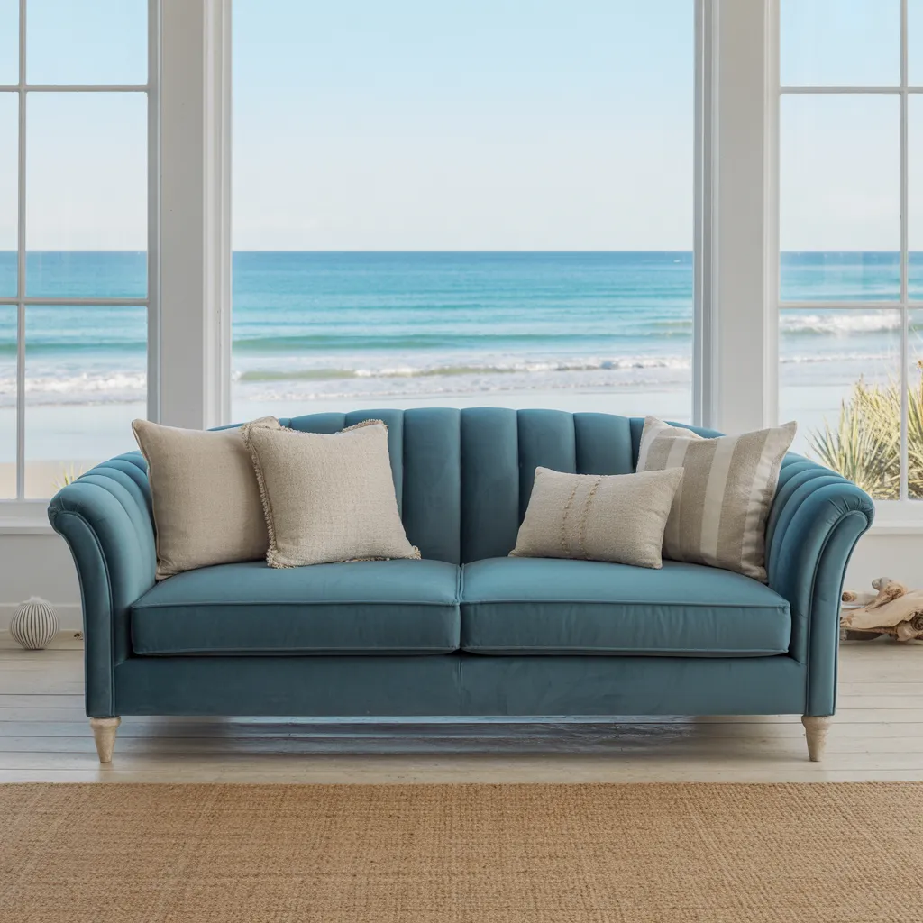 A plush teal velvet sofa takes center stage, backdropped by full-length windows revealing breathtaking ocean vistas. Beachy elements like woven natural fiber accents and crisp white window frames balance the sofa’s rich texture. Cream linen pillows with delicate tasseled trim lend a casual, coastal vibe. This fusion of the sofa’s sumptuous velvet upholstery with breezy, sun-drenched decor epitomizes an elevated yet laidback beach house aesthetic. The deep teal hue offers a sophisticated contrast to the serene blues of the seascape beyond the windows, while warm beige tones from the area rug and pillows create an inviting, grounded ambiance.