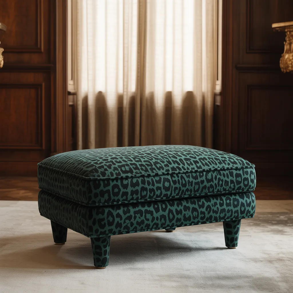 An emerald green, plush velvet ottoman sits prominently in a wood-paneled room, casting dramatic leopard-print shadows on the hardwood floor from the light filtering through sheer curtains. The contemporary furniture piece boasts a tufted top and short tapered legs, exuding a luxurious yet fresh bohemian flair. The rich green velvet upholstery features an eye-catching leopard motif in deeper tones, lending a bold focal point amid the warm wood tones and muted light. The stylish ottoman exemplifies how velvet can elevate a space with sumptuous depth and an eclectic mix of textures and patterns.