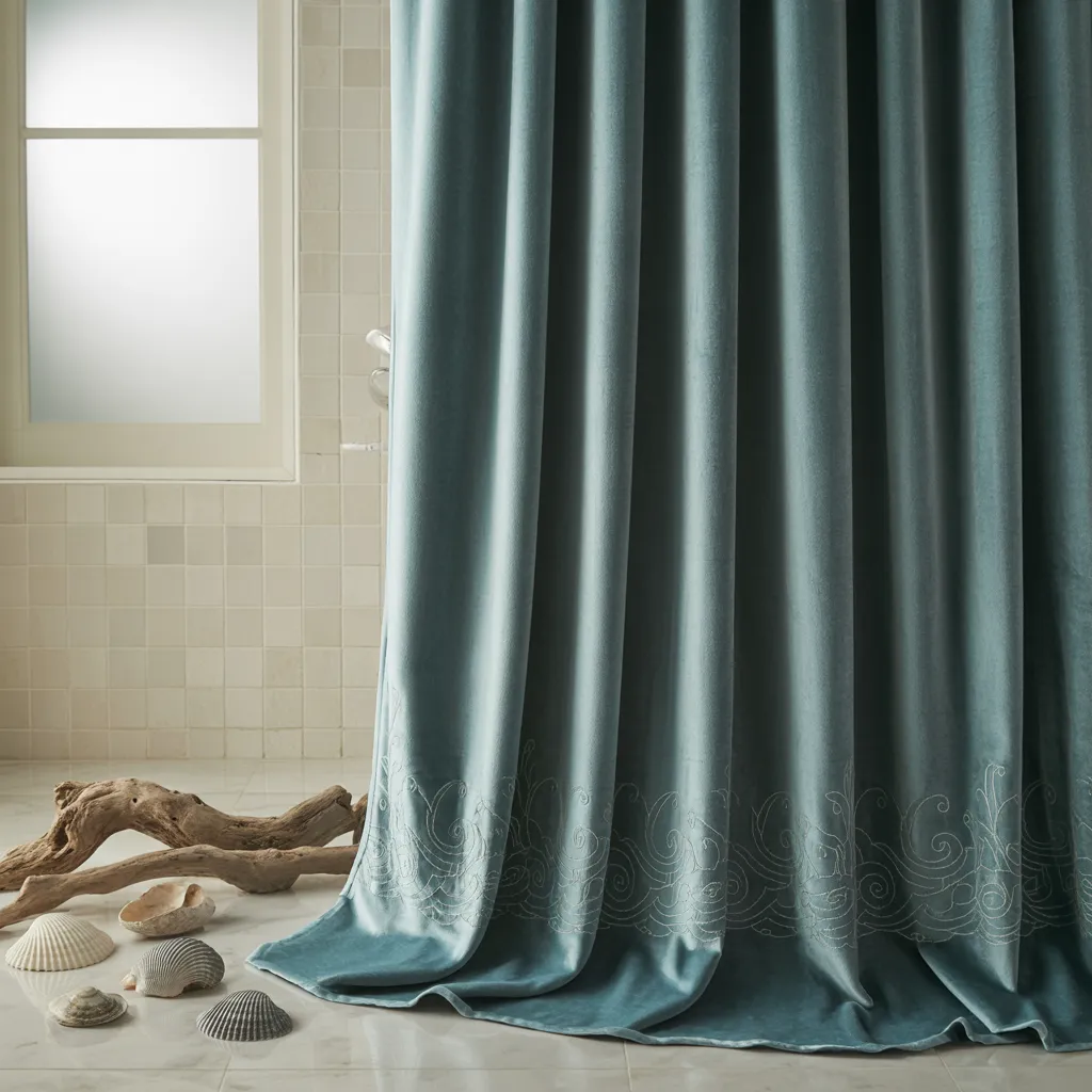 Heavy teal velvet curtains drape gracefully, concealing glimpses of a tiled wall and frosted window. The intricate swirl patterns embroidered along the bottom hems create an elegant, understated oceanic vibe. Contrasting the opulent textile are driftwood pieces and seashells scattered on the tiled floor—a harmonious blend of coastal charm and sophisticated luxury. The muted color palette exudes tranquility, while the varied textures from the sleek tiles, plush velvet, and raw organic elements establish a serene yet visually captivating ambiance. This scene exemplifies how contemporary coastal interiors can artfully integrate rich, sumptuous materials like velvet to create an inviting, tactile space that merges elegance with relaxed beachy flair.