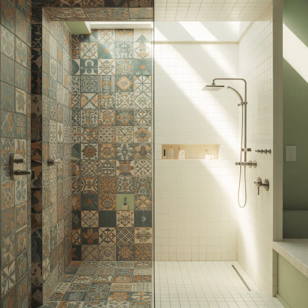 A shower space split by contrast: one side covered in busy, colorful patterned tiles and the other in simple white tiles washed in sunlight showing visual overload vs calming simplicity.