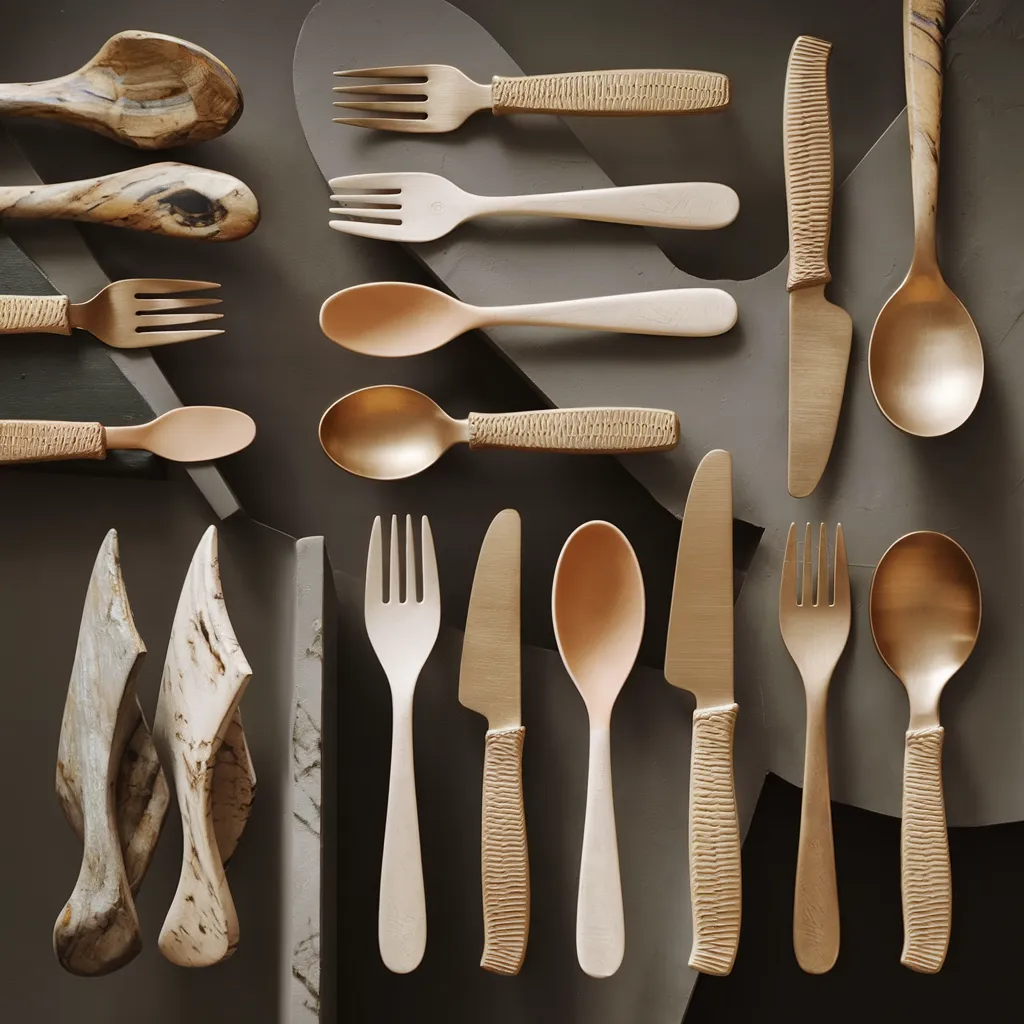 An artful assemblage of flatware spanning materials from reclaimed bone to hand-carved wood and polished stainless steel. This eclectic contemporary collection juxtaposes organic, rustic elements like twig-handled forks alongside sleek, industrial-inspired utensils in matte metallics. The warm, earthy color palette of browns, tans, and grays is accented by brushed copper and golden tones. Woven textures on several pieces evoke a natural, handcrafted feel. This curated array celebrates the innovative merging of sustainable, eco-conscious design with refined craftsmanship and sculptural forms. The blend of humble materials and high-design aesthetics redefines cutlery as functional art for the modern table.