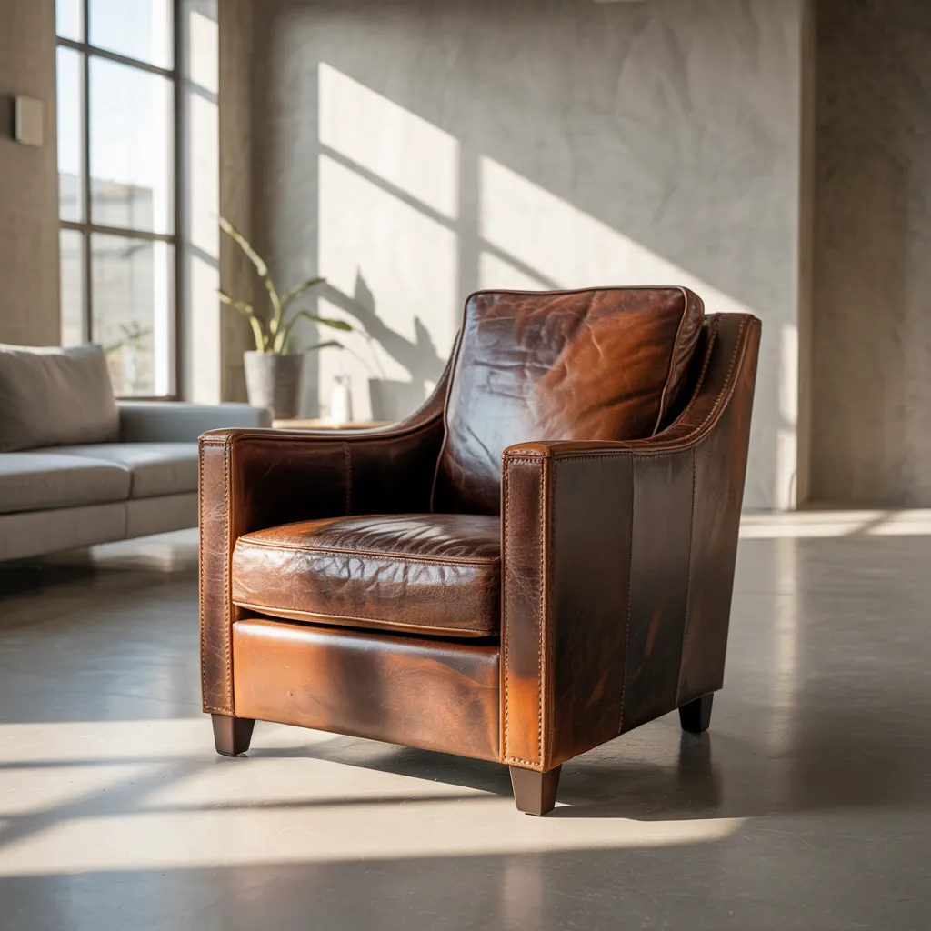 A buttery leather armchair takes center stage, bathed in sunlight filtering through tall windows. Its distressed upholstery and nailhead trim exude a rustic warmth, while clean lines lend a modern sensibility. The deep caramel hue complements the concrete-look walls and hardwood floors. Nearby, a plush grey sofa provides a soft textural contrast against the rich leather accents. Natural materials like wood and plant life harmonize with the industrial undertones, creating an earthy yet refined living space. Warm terracotta and camel tones blend with ashy greys for an inviting palette that feels both timeless and fresh.