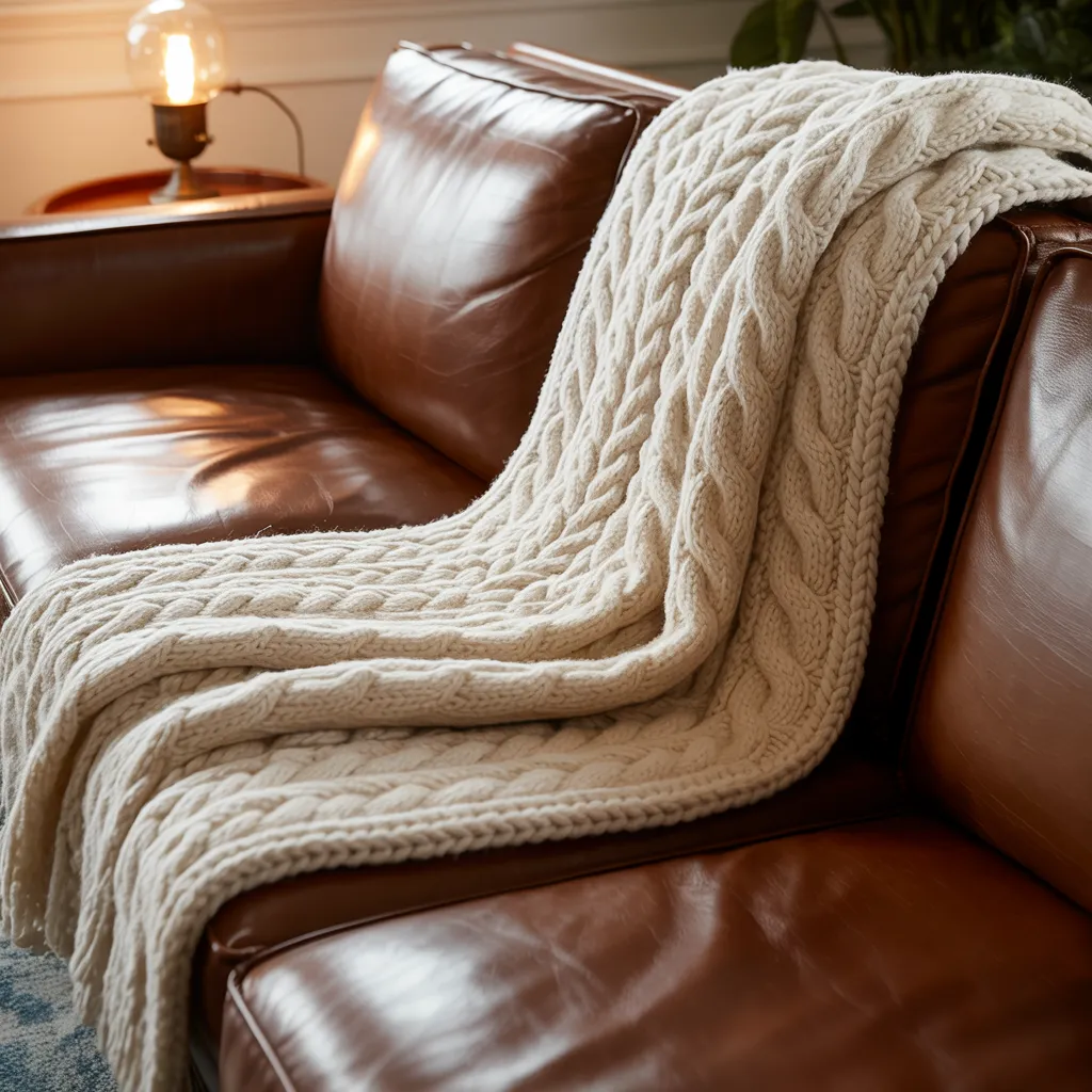 A plush cream-colored cable knit blanket lays draped over a worn brown leather armchair, creating a cozy and inviting textural contrast. The rustic scene exudes a sense of warmth and comfort, with the flickering glow of a small lamp adding to the ambiance. The chunky knit fabric alongside the supple leather upholstery exemplifies the modern rustic interior design style. The dominant earthy color palette features rich caramel tones complemented by the creamy off-white accents of the textiles. This vignette beautifully showcases the art of layering diverse materials and textures to cultivate a relaxing and welcoming atmosphere.
