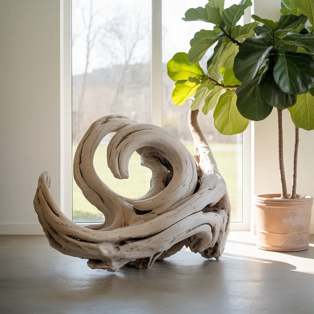 A twisted, sculpted piece of driftwood takes center stage, its pale tan swirls creating an organic, eye-catching centerpiece. Placed beside a potted fiddle-leaf fig tree in warm terracotta, this vignette exemplifies modern rustic design. The natural materials and muted color palette infuse the space with an earthy, grounded aesthetic. Blending raw, untreated wood tones with lush greenery allows the outdoors to harmoniously coexist indoors. Subtle neutral hues and crisp white highlights produce a calming, understated environment, connecting the interior to the serene beauty of nature outside its windows.