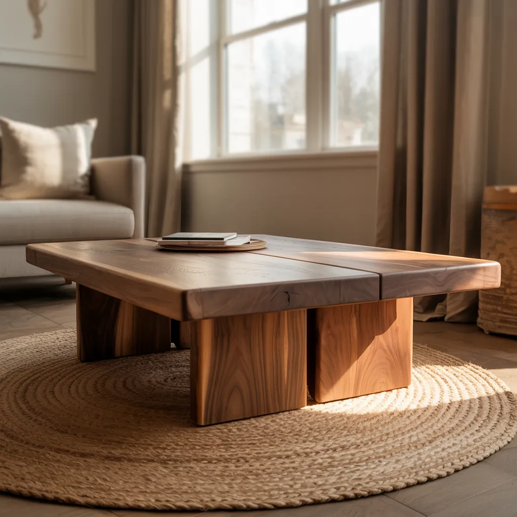 A chunky, rustic coffee table anchors this cozy living room setup. Crafted from warm, solid wood with contrasting grain patterns, the table features a simple yet refined design with a raised lip. A magazine rests atop its smooth surface. Surrounding the table is a plush, hand-woven jute area rug in soft, neutral tones that add inviting texture. Natural light filters in through large windows, illuminating the space’s calming color palette of warm browns, taupes, and creams. An understated sofa in a soft beige completes the relaxed, rustic-modern aesthetic filled with natural wood, textile, and leather accents.