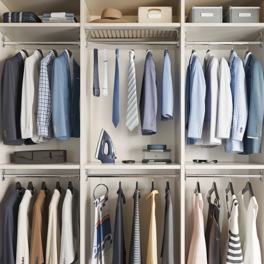 An organized, functional closet with racks displaying diverse clothing items in neutral tones. Iron and steamer sit ready on a shelf, signaling the space’s utility as a laundry area.