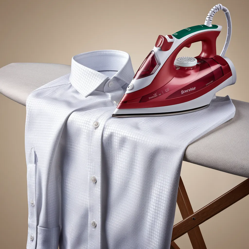 A sleek, modern steam iron rests atop a crisp white dress shirt on an ironing board, showcasing practical functionality. The iron’s glossy red hue and sculptural white accents exude a contemporary aesthetic. Its ergonomic design with textured grip and flexible cord hints at user-friendly operation. The shirt’s immaculate cotton fabric, accompanied by the iron’s powerful steam vents, underscores the effortless ability to achieve impeccably pressed, wrinkle-free garments. This streamlined still life harmonizes clean lines with purposeful domestic tools, exemplifying minimalist style with a pop of vibrant color.